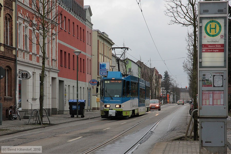 Straßenbahn Cottbus - 140 Triebwagen 140 auf Linie 1 nach Schmellwitz Anger bei der Ankunft an der Haltestelle Nordfriedhof, aufgenommen am 23. Februar 2016 in der Karlstraße. Photo: Bernd Kittendorf (info@bernd-kittendorf.de) Homepage: www.bernd-kittendorf.de |