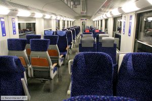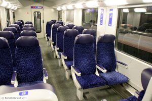 Sitze im Fahrgastraum des Wagens 50 81 21 73119-6 A-ÖBB (Typ Bmpz-l, Sitztestwagen), aufgenommen am Abend des 29. März 2011. Nicht nur Zugbegleiter, auch Fahrgäste gehen während der Fahrt durch den Zug. Sowohl nach dem Zustieg als auch vor dem Ausstieg bei Unterwegshalten ist das die Regel. Die bisherigen Sitze bieten dabei wenig Halt. Sowohl das Abstützen an der Kopfstütze als auch der Griff zur Armlehne eines besetzten Platzes irritiert die dort sitzenden Mitreisenden. Die neuen Sitze hatten teilweise einen paktischen Griff - aus meiner Sicht aber auch konstruktiv ungünstige Lösungen (Griffigkeit des Griffs selbst, Erschütterung der Rückenlehne) und teilweise noch ungünstigere Verhältnisse durch die Form der Kopfstützen als die aktuell verwendeten Sitze.