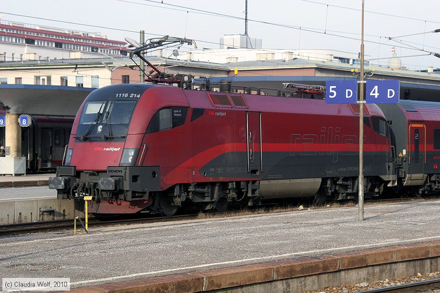 | ÖBB - 1116 214 Lok 1116 214 in Wien Westbahnhof auf Gleis 6, aufgenommen am 23. Februar 2010. Die Lok trägt den Namen Spirit of Hungary. Photo: Claudia Wolf (info@claudia-blondie-wolf.de) Homepage: www.claudia-blondie-wolf.de |