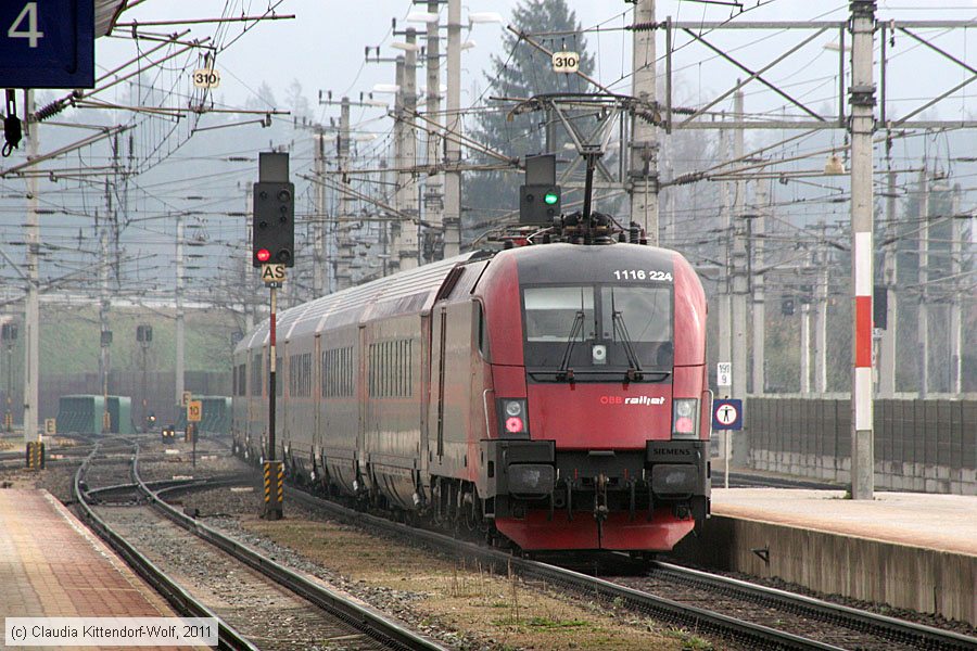 | ÖBB - 1116 224 Lok 1116 224 mit einem Railjet in Wörgl Hauptbahnhof, aufgenommen am 27. März 2011. Photo: Claudia Kittendorf-Wolf (info@claudia-blondie-wolf.de) Homepage: www.claudia-blondie-wolf.de |