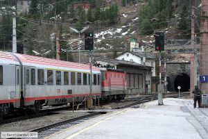 Lok 91 81 1144 033-8 A-ÖBB bei der Fahrt durch den Bahnhof Semmering, aufgenommen am 18. März 2011.