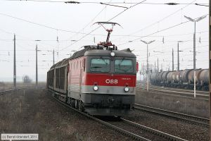Lok 91 81 1144 056-7 A-ÖBB (so die seitliche Aufschrift) bei der Fahrt durch Wiener Neustadt Hauptbahnhof, aufgenommen am 14. März 2011.