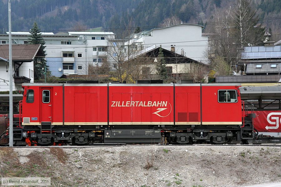| Zillertalbahn - D 13 Lok D 13 in Jenbach, aufgenommen am 26. März 2011. Es handelt sich um eine Lok des Typs Gmeinder D 75 BB-SE, die 2004 gebaut wurde. Sie war bis 2017 beim Betrieb und wurde 2018 weiter verkauft. Diese Lokomotiven haben zwei Endführerstände. Photo: Bernd Kittendorf (info@bernd-kittendorf.de) Homepage: www.bernd-kittendorf.de |