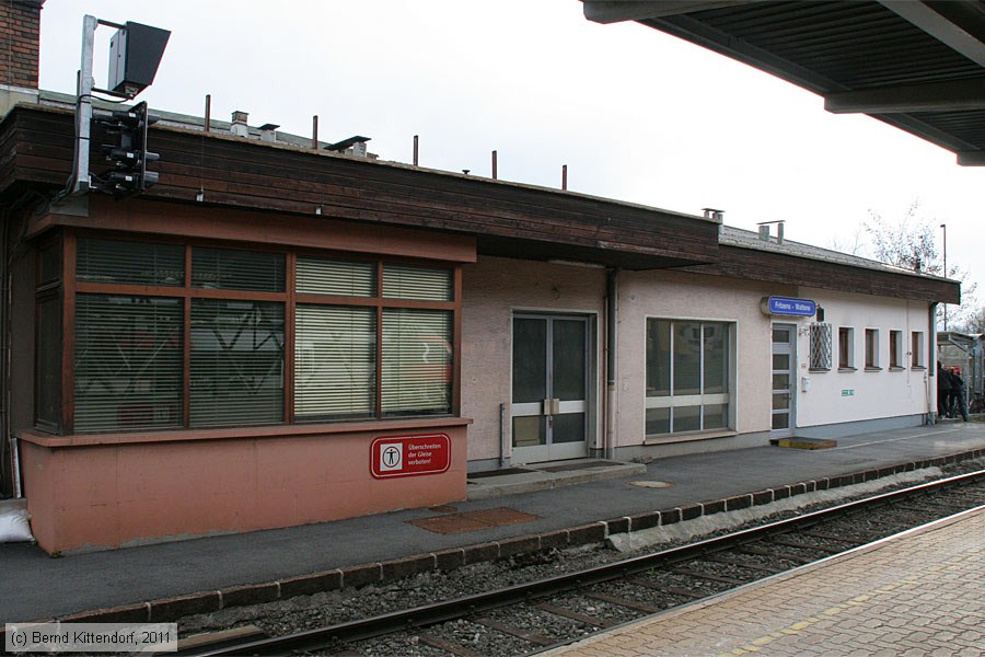 | Bahnhof Fritzens-Wattens Gebäude des Bahnhofs Fritzens-Wattens, aufgenommen am 26. März 2011 von der Bahnsteigseite. Photo: Bernd Kittendorf (info@bernd-kittendorf.de) Homepage: www.bernd-kittendorf.de |