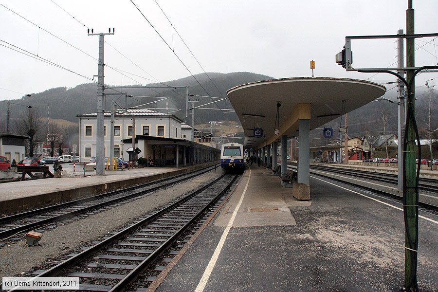| Bahnhof Mürzzuschlag Bahnsteige und Gleise im Bahnhof Mürzzuschlag, aufgenommen am 18. März 2011. Diese Station befindet sich an der Semmeringbahn bei Kilometer 116.7 auf Höhe 679 m. Photo: Bernd Kittendorf (info@bernd-kittendorf.de) Homepage: www.bernd-kittendorf.de |