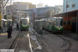 Triebwagen 605 auf Linie 4 (links im Bild) und Triebwagen 601 auf Linie 5 (rechts im Bild) an der Haltestelle Andritz, aufgenommen am 03. Februar 2010.