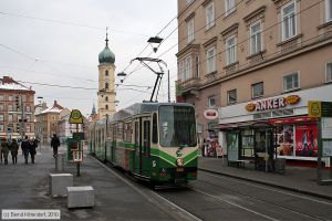 Triebwagen 605 auf Linie 4 an der Haltestelle Andritz, aufgenommen am 03. Februar 2010.