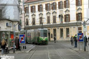 Triebwagen 605 an der Haltestelle Jakominiplatz, aufgenommen am 04. Februar 2010.