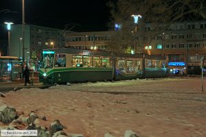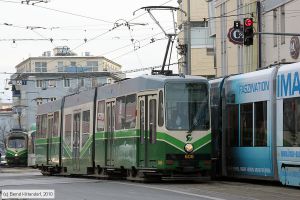 Triebwagen 608 auf Linie 6 nach Sankt Peter, aufgenommen am 04. Februar 2010 an der Haltestelle Hauptbahnhof.