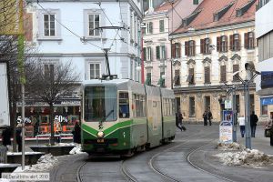 Triebwagen 608 auf Linie 7 nach Sankt Leonhard Landeskrankenhaus an der Haltestelle Alte Poststraße, aufgenommen am 03. Februar 2010.