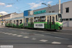 Triebwagen 608 auf Linie 1 nach Eggenberg Unfallkrankenhaus bei der Abfahrt von der Haltestelle Waagner-Biro-Straße / PVA, aufgenommen am 09. Juli 2015. Die Gleise unten im Bild verbinden die Strecken in Richtung Laudongasse (links) und in Richtung Alte Poststraße (rechts). Die Gebäude im Hintergrund werden von Siemens Transportation Systems genutzt.