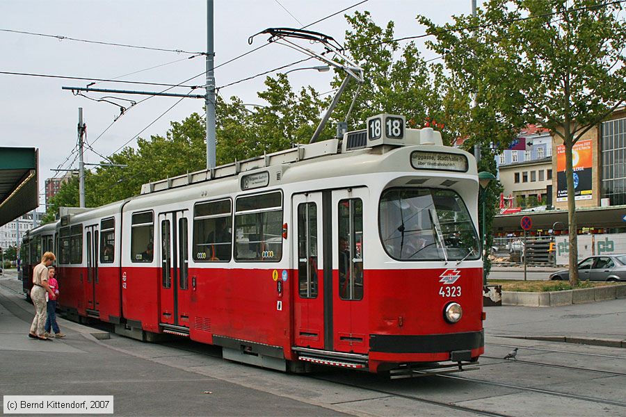 | Wien - Straßenbahn - 4323 Triebwagen 4323 auf Linie 18 nach Burggasse / Stadthalle bei der Abfahrt von der Haltestelle Westbahnhof, aufgenommen am 10. August 2007. Photo: Bernd Kittendorf (info@bernd-kittendorf.de) Homepage: www.bernd-kittendorf.de |