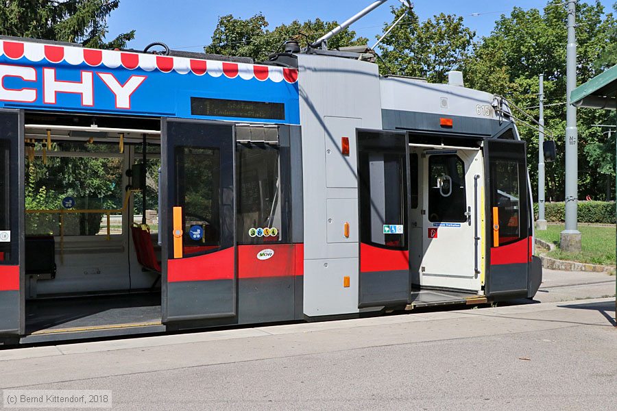 | Wien - Straßenbahn - 615 Triebwagen 615 auf Linie 1 zum Stefan-Fadinger-Platz an der Haltestelle Prater Hauptallee, aufgenommen am 18. August 2018. ULF (die Abkürzung für Ultra Low Floor, englisch für Niedrigstflur) bedeutet keineswegs, daß Bahnsteighöhe und Einstiegshöhe wirklich so aufeinander abgestimmt wären, daß kein Höhenunterschied mehr zu überwinden wäre. Mit der elektrohydraulischen Niveauregulierung sollte die Einstiegshöhe bei diesem Triebwagen konstant auf 197 mm stehen können. Beim einstellbaren Winterniveau lag die Einstiegshöhe bei konstant 240 mm. Mit ausgebauter Niveauregulierung oder wie bei den zuletzt gelieferten Triebwagen von Anfang an ohne werden ungeregelte 225 mm daraus. Anfangs technischer Aufwand auf der Seite des Fahrzeugs und dann spart man sich die passende Erhöhung eines Bahnsteigs, was an dieser Stelle problemlos machbar wäre. An der Fahrgasttür bei der Fahrerkabine gibt es eine manuelle Klapprampe für Rollstühle. Photo: Bernd Kittendorf (info@bernd-kittendorf.de) Homepage: www.bernd-kittendorf.de |