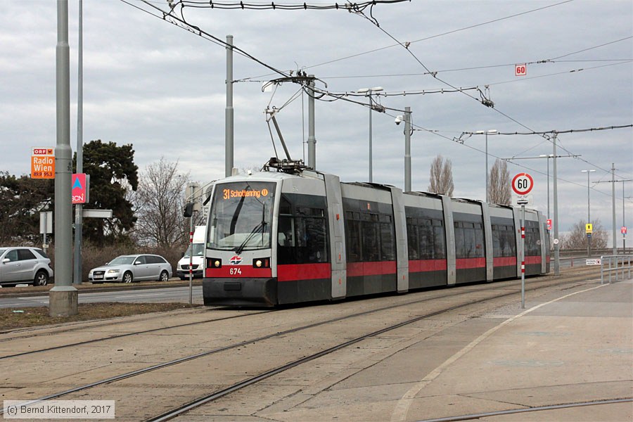 | Wien - Straßenbahn - 674 Triebwagen 674 auf Linie 31 zum Schottenring bei der Ankunft an der Haltestelle Friedrich-Engels-Platz, aufgenommen am 23. Februar 2017. Photo: Bernd Kittendorf (info@bernd-kittendorf.de) Homepage: www.bernd-kittendorf.de |