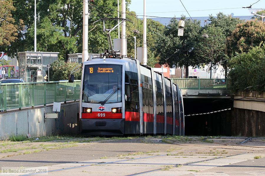| Wien - Straßenbahn - 699 Triebwagen 699 auf Linie 18 nach Burggasse / Stadthalle aus Richtung der Haltestelle Eichenstraße kommend beim Verlassen des Tunnels, aufgenommen am 18. August 2018. Inzwischen wurde das Fahrzeug mit besser erkennbaren LED-Anzeigen für Linienbezeichnung und Fahrtziel umgerüstet. Photo: Bernd Kittendorf (info@bernd-kittendorf.de) Homepage: www.bernd-kittendorf.de |