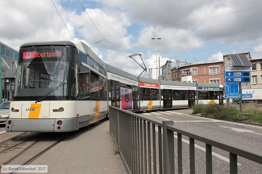 | Straßenbahn Antwerpen - 7224 Triebwagen 7224 auf Linie 12 an der Endstelle Sportpaleis, aufgenommen am 21. August 2017. Am Ende des Bahnsteigs wird es für die ausgestiegenen Fahrgäste eng, wenn die Züge in die Blockumfahrung abfahren. Photo: Bernd Kittendorf (info@bernd-kittendorf.de) Homepage: www.bernd-kittendorf.de |