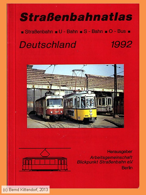 | Straßenbahnatlas Deutschland 1992 Das Buch enthält gezeichnete Liniennetzpläne und Fahrzeuglisten der Straßenbahnbetriebe Deutschlands. Arbeitsgemeinschaft Blickpunkt Straßenbahn e.V. Berlin, erschienen 1992, 264 Seiten, 14,8 cm x 21,0 cm, ISBN: 3-926524-12-X. Scan: Bernd Kittendorf (info@bernd-kittendorf.de) Homepage: www.bernd-kittendorf.de |