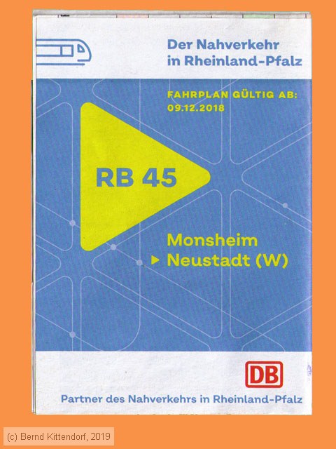 | Deutsche Bahn - Streckenfahrplan Zu den nützlichen Kleinigkeiten, die bei Fahrten mit der Bahn immer wieder gute Dienste leisten, zählen für mich die Streckenfahrpläne. Dieser hier stellt die Verbindungen von Monsheim über Grünstadt, Freinsheim und Bad Dürkheim nach Neustadt (Weinstraße) und in der Gegenrichtung für die Fahrplanperiode ab 09. Dezember 2018 dar. Die Streckenfahrpläne waren an Bahnhöfen in der Region und in den Zügen gratis erhältlich. Deutsche Bahn, Streckenfahrplan KBS 667 ab 09. Dezember 2018, ca 29,6 cm x 42,0 cm (gefaltet ca 7,4 cm x 10,7 cm), ISBN: ohne Scan: Bernd Kittendorf (info@bernd-kittendorf.de) Homepage: www.bernd-kittendorf.de |