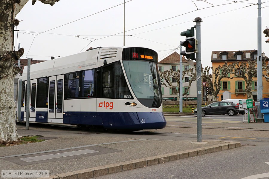 Tram Genève - 1830 Triebwagen 1830 auf Linie 12 bei der Ankunft an der Endstelle Carouge-Rondeau, aufgenommen am 27. März 2018. Photo: Bernd Kittendorf (info@bernd-kittendorf.de) Homepage: www.bernd-kittendorf.de |