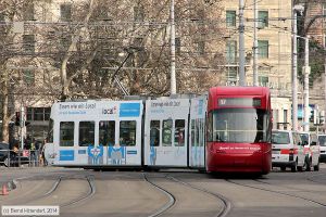 Triebwagen 3016 auf Linie 4 zum Bahnhof Tiefenbrunnen an der Haltestelle Central, aufgenommen am 11. März 2014.