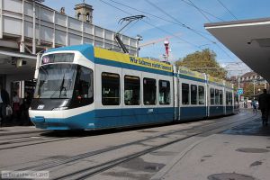 Triebwagen 3013 auf Linie 4 zum Bahnhof Altstetten Nord an der Haltestelle Bahnhof Tiefenbrunnen, aufgenommen am 17. September 2013 auf dem äußeren Gleis der Wendeschleife. Die Haltestelle liegt in der Kurve vor dem Ende der Wendeschleife unmittelbar am Hausbahnsteig des Bahnhofs. Allerdings verbleibt beim Ein- und Ausstieg ein beträchtlicher Höhenunterschied zu überwinden (kleiner Bildausschnitt links unten). Niederflurtechnik bei den Fahrzeugen allein ergibt noch keine Barrierefreiheit, auch die Bahnsteige müssen jeweils passen.