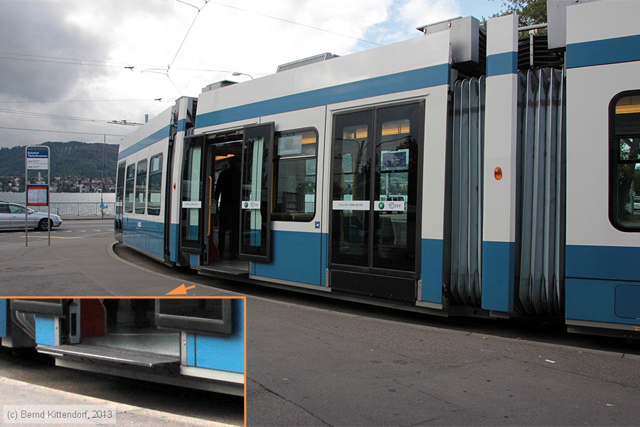 | Zürich - Straßenbahn - 3013 Triebwagen 3013 auf Linie 4 zum Bahnhof Altstetten Nord an der Haltestelle Bahnhof Tiefenbrunnen, aufgenommen am 17. September 2013 auf dem äußeren Gleis der Wendeschleife. Die Haltestelle liegt in der Kurve vor dem Ende der Wendeschleife unmittelbar am Hausbahnsteig des Bahnhofs. Allerdings verbleibt beim Ein- und Ausstieg ein beträchtlicher Höhenunterschied zu überwinden (kleiner Bildausschnitt links unten). Niederflurtechnik bei den Fahrzeugen allein ergibt noch keine Barrierefreiheit, auch die Bahnsteige müssen jeweils passen. Photo: Bernd Kittendorf (info@bernd-kittendorf.de) Homepage: www.bernd-kittendorf.de |