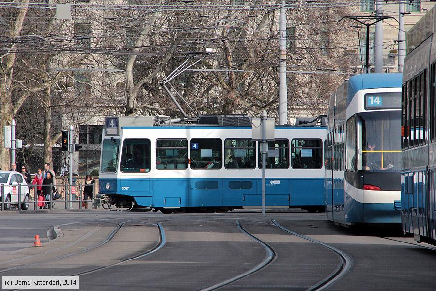 | Zürich - Straßenbahn - 2067 Triebwagen 2067 auf Linie 4 zum Bahnhof Altstetten Nord bei der Haltestelle Bahnhofquai / HB, aufgenommen am 11. März 2014. Photo: Bernd Kittendorf (info@bernd-kittendorf.de) Homepage: www.bernd-kittendorf.de |