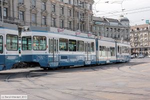 Triebwagen 2105 auf Linie 7 nach Wollishofen beim Hauptbahnhof, aufgenommen am 17. September 2013. Der Niederflur-Wagenkasten (die Sänfte) wurde nachträglich in den Triebwagen aus dem Jahr 1992 eingebaut und das Fahrzeug so zum Be 4/8.