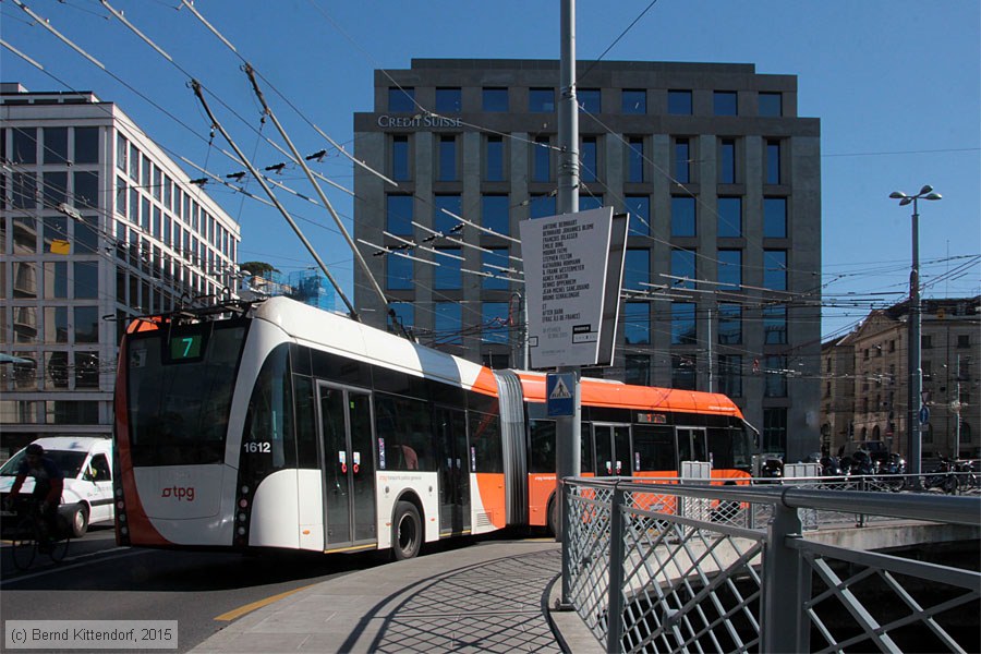 | Trolleybus Genève - 1612 Gelenk-Oberleitungsbus 1612 auf Linie 7 nach Hôpital bei der Ankunft an der Haltestelle Bel-Air, aufgenommen am 08. April 2015. Photo: Bernd Kittendorf (info@bernd-kittendorf.de) Homepage: www.bernd-kittendorf.de |