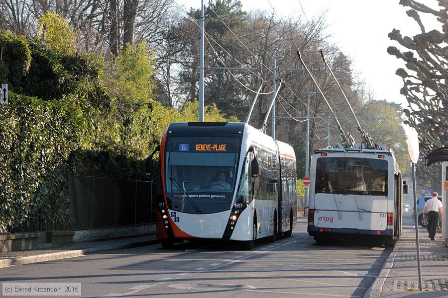 | Trolleybus Genève - 1617 Gelenktrolleybus 1617 auf Linie 6 kurz vor der Wendeschleife bei der Endstelle Genève-Plage, aufgenommen am 09. April 2015. Der Ausstieg für die Fahrgäste erfolgt erst nach Durchfahren der Schleife. Rechts im Bild ist Gelenktrolleybus 731 auf Linie 6 nach Vernier kurz vor seiner Abfahrt zu sehen. Photo: Bernd Kittendorf (info@bernd-kittendorf.de) Homepage: www.bernd-kittendorf.de |