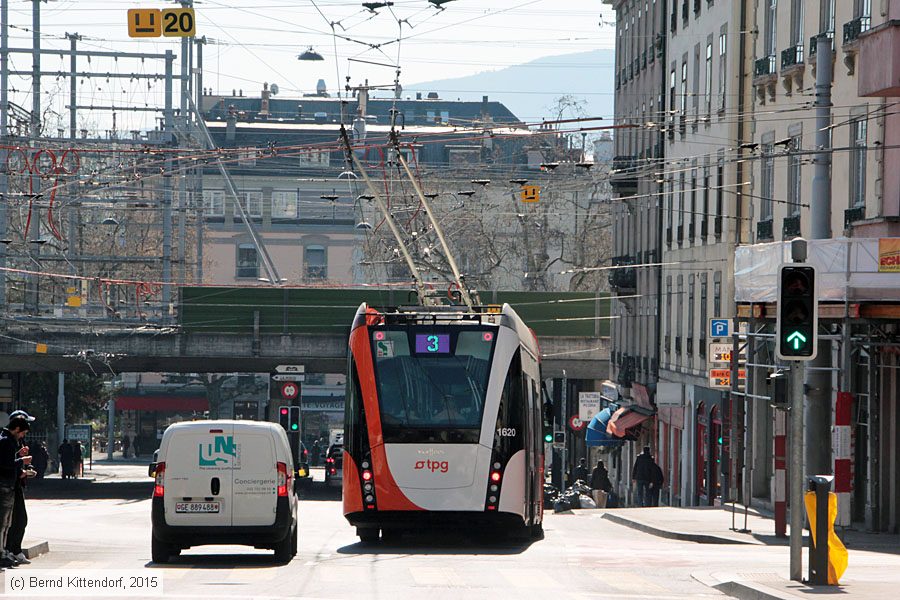 | Trolleybus Genève - 1620 Gelenk-Oberleitungsbus 1620 auf Linie 3 nach Champel bei der Abfahrt von der Haltestelle Lyon, aufgenommen am 09. April 2015. Photo: Bernd Kittendorf (info@bernd-kittendorf.de) Homepage: www.bernd-kittendorf.de |