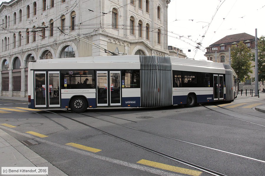 | Trolleybus Genève - 786 Doppel-Gelenk-Oberleitungsbus 786 auf Linie 10 nach Rive bei der Abfahrt von der Haltestelle Bel-Air, aufgenommen am 16. Oktober 2016. Die Fahrt geht hier über den Place de Hollande. Die Stromabnehmerstangen befinden sich auf dem Nachläufer. Dieser hat zwei Doppeltüren für den Fahrgastwechsel. Photo: Bernd Kittendorf (info@bernd-kittendorf.de) Homepage: www.bernd-kittendorf.de |