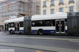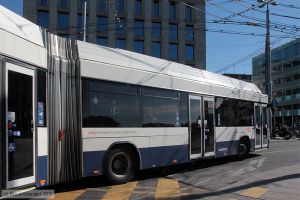 Doppel-Gelenk-Oberleitungsbus 786 auf Linie 10 nach Rive bei der Abfahrt von der Haltestelle Bel-Air, aufgenommen am 16. Oktober 2016. Diese Doppelgelenkwagen des Typs lighTram 3 von den Herstellern Hess und Kiepe bestehen aus einem zweiachsigen Vorderwagen mit zwei Doppeltüren für den Fahrgastwechsel, einem mittleren Fahrzeugteil mit einer Achse und einer Doppeltür und dem einachsigen Nachläufer mit den beiden Stromabnehmerstangen und zwei Doppeltüren für den Fahrgastwechsel. Es gibt dazwischen zwei Faltenbalg-Übergänge.