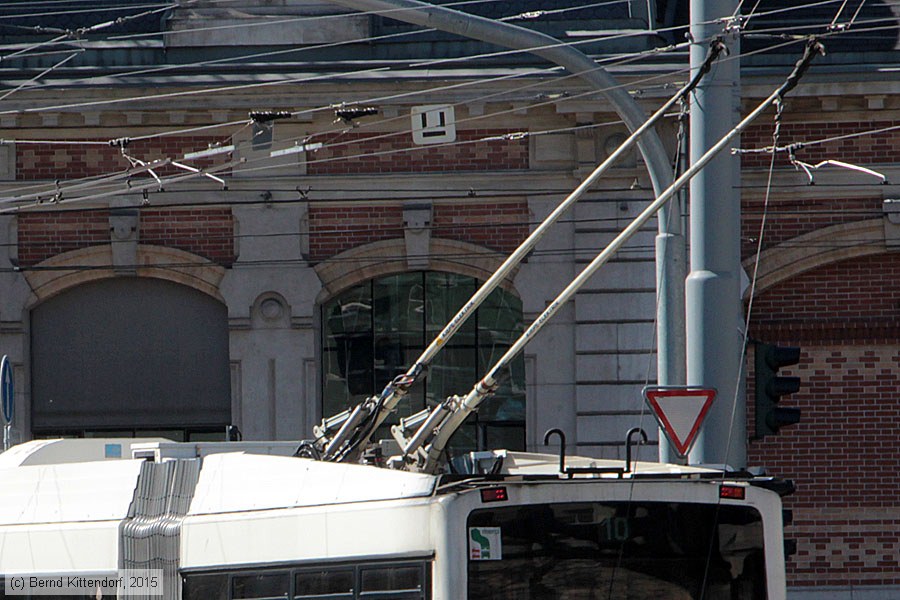 | Trolleybus Genève - 787 Stromabnehmerstangen des Doppel-Gelenk-Oberleitungsbusses 787, aufgenommen nahe der Haltestelle Coutance am 08. April 2015 am Fahrdraht. Photo: Bernd Kittendorf (info@bernd-kittendorf.de) Homepage: www.bernd-kittendorf.de |