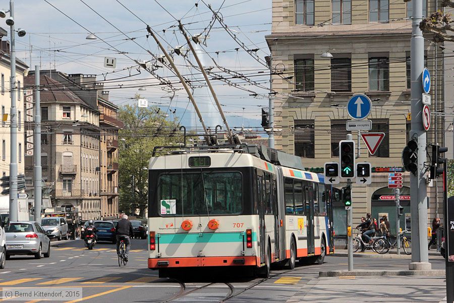 | Trolleybus Genève - 707 Gelenk-Oberleitungsbus 707 auf Linie 19 in Richtung Onex-Cité bei der Ankunft an der Haltestelle Coutance, aufgenommen am 29. April 2015. Das Fahrzeug biegt nach rechts in die Rue de Cornavin ab. Ein Blick auf die Verkehrszeichen ergibt: Busse dürfen das. Photo: Bernd Kittendorf (info@bernd-kittendorf.de) Homepage: www.bernd-kittendorf.de |