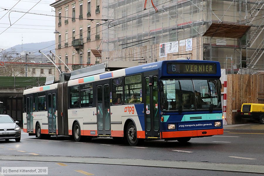| Trolleybus Genève - 713 Gelenk-Oberleitungsbus 713 auf Linie 6 nach Vernier bei der Abfahrt von der Haltestelle Gare Cornavin, aufgenommen am 28. März 2018. Photo: Bernd Kittendorf (info@bernd-kittendorf.de) Homepage: www.bernd-kittendorf.de |