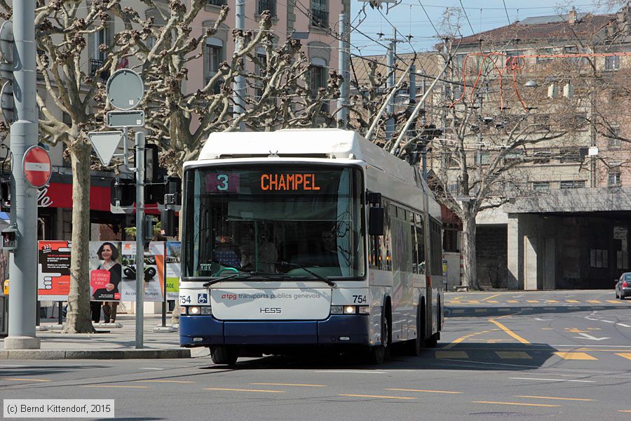 | Trolleybus Genève - 754 Gelenk-Oberleitungsbus 754 auf Linie 3 nach Champel bei der Ankunft an der Haltestelle Coutance, aufgenommen am 10. April 2015. Photo: Bernd Kittendorf (info@bernd-kittendorf.de) Homepage: www.bernd-kittendorf.de |