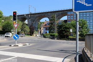 Fußweg zwischen der Endstelle Maladière der Linien 1 und 6 und der Haltestelle Maladière-Figuiers der Linie 25 für die Fahrtrichtung Renens, aufgenommen am 16. Juli 2018. Die Endstelle befindet sich auf dem Platz oben an der Treppe (links oben im Bild), eine recht steile Rampe führt hinab zur Personenunterführung unter der Straße rechts im Bild, an der auch die Fahrleitung der Trolleybus-Linie 25 zu sehen ist. Danach folgt eine Rampe aufwärts zur Straße und der Haltestelle Maladière-Figuiers. Gut, daß der Hilfsantrieb meines Rollstuhls auch beim Bremsen unterstützt.