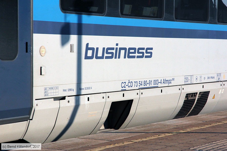 | České Dráhy - 73548091003-4 Beschriftung business am Steuerwagen 73 54 80 91003-4 CZ-ČD (Typ Afmpz890, ČD-Railjet), aufgenommen am 25. Juli 2017. In diesem Wagen gibt es 38 Sitzplätze (teils business, teils 1. Klasse). Photo: Bernd Kittendorf (info@bernd-kittendorf.de) Homepage: www.bernd-kittendorf.de |