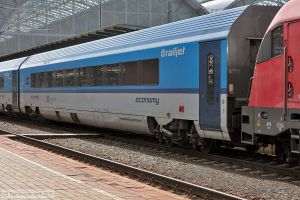 Wagen 73 54 20 91001-1 CZ-ČD (Typ Bmpz893, ČD-Railjet) in Brno Hlavní nádraží, aufgenommen am 13. Oktober 2015. Vorn am Zug befindet sich die Lok 91 81 1216 250-1 A-ÖBB (rechts am Bildrand).