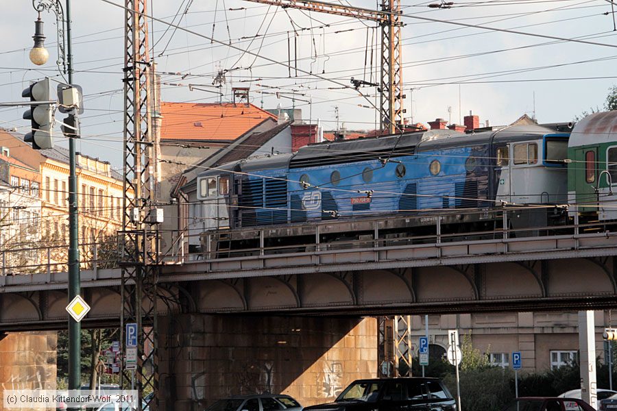 | České Dráhy - 750704-9 Lok 750 704-9 in Praha auf der Eisenbahnbrücke über die Moldau, von der Straßenbahn-Haltestelle Výtoň aus gesehen und aufgenommen am 21. Oktober 2011. Photo: Claudia Kittendorf-Wolf (info@claudia-blondie-wolf.de) Homepage: www.claudia-blondie-wolf.de |