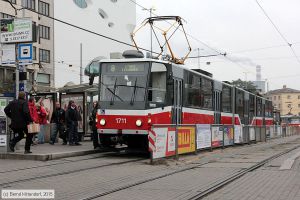 Triebwagen 1711 auf Linie 8 nach Starý Lískovec an der Haltestelle Hlavní nádraží, aufgenommen am 13. Oktober 2015.