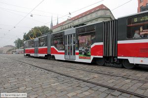 Triebwagen 1718 auf Linie 8 nach Starý Lískovec bei der Abfahrt von der Haltestelle Hlavní nádraží, aufgenommen am 13. Oktober 2015.