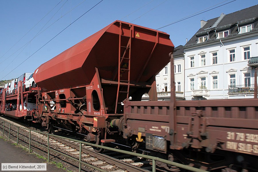 | Deutsche Bahn - 21806463099-7 Wagen 21 80 6463 099-7 (Typ Fcs092) in einem Güterzug bei der Fahrt durch Rüdesheim (Rhein), aufgenommen am 07. April 2011. Photo: Bernd Kittendorf (info@bernd-kittendorf.de) Homepage: www.bernd-kittendorf.de |