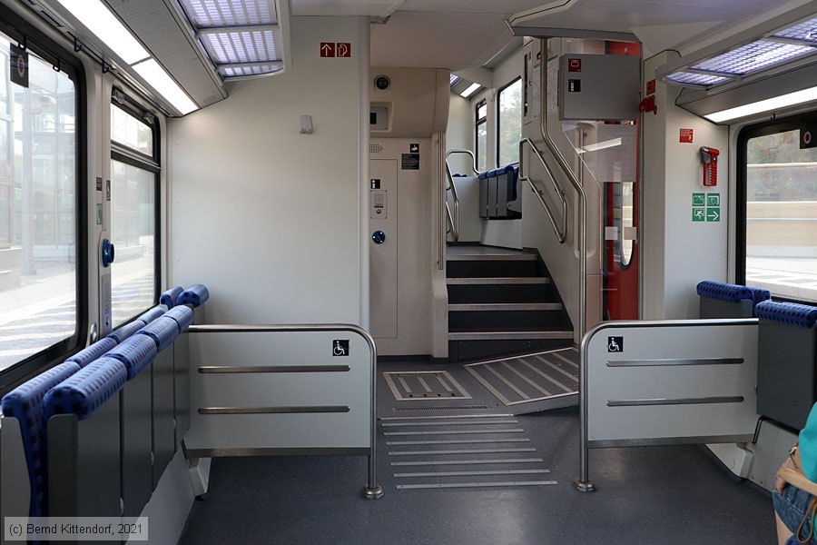 | Deutsche Bahn - 50803681193-5 - Innenansicht Blick auf die beiden Rollstuhlplätze im Doppelstockwagen 50 80 36 81193-5 D-DB (Typ DABpbza789.0), aufgenommen am 28. September 2021. Zwischen Einstiegsbereich und der Vorrichtung gegen das Umkippen der Rollstühle (senkrechtes Brett) gibt es je einen Einzelsitz quer zur Fahrtrichtung mit dem Fußraum im Gefälle der Rampe im Mittelgang und mit bequemem Zugriff auf Taschen an der Rückseite der dort abgestellten Rollstühle und direkten Weg zur Ausgangstür. Im Einstiegsbereich ist der Fahrzeugboden nicht eben, zu den Türen hin gibt es jeweils eine Steigung. Zu dem Bereich für die Rollstühle führt eine Rampe im Fußboden mit Leisten gegen ein Rutschen. An den Rollstuhlplätzen gibt es Klappsitze (links im Bild vier davon), jedoch keinerlei Haltemöglichkeit für das subjektive Sicherheitsgefühl des Menschen im Rollstuhl - von der wenig griffigen Öse für das Anschließen von - was auch immer - einmal abgesehen. Die Treppe zum Wagenende hin endet unten in der Schräge einer Rampe. Das wandseitige Geländer und die Griffstange neben der Fahrgasttür sind nicht verbunden. Das ist für Sehbehinderte beides unpraktisch. Die Hand vom Geländer wegnehmen müssen, weil es endet und das bei dem Übergang zur Rampe - das wäre besser lösbar gewesen. Photo: Bernd Kittendorf (info@bernd-kittendorf.de) Homepage: www.bernd-kittendorf.de |