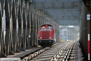 Lok 92 80 1212 036-8 D-DB aus Richtung Ludwigshafen kommend in Mannheim auf der etwa 274 m langen Stahlfachwerkbrücke über den Rhein, aufgenommen am 27. September 2011.