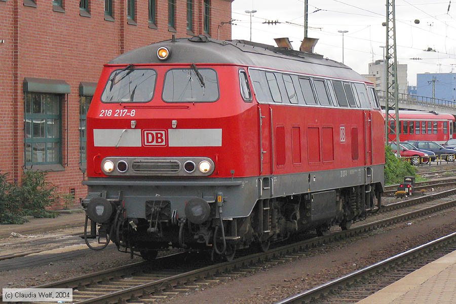 | Deutsche Bahn - 218217-8 Lok 218217-8 in Koblenz Hauptbahnhof, aufgenommen am 15. Oktober 2004. Photo: Claudia Wolf (info@claudia-blondie-wolf.de) Homepage: www.claudia-blondie-wolf.de |