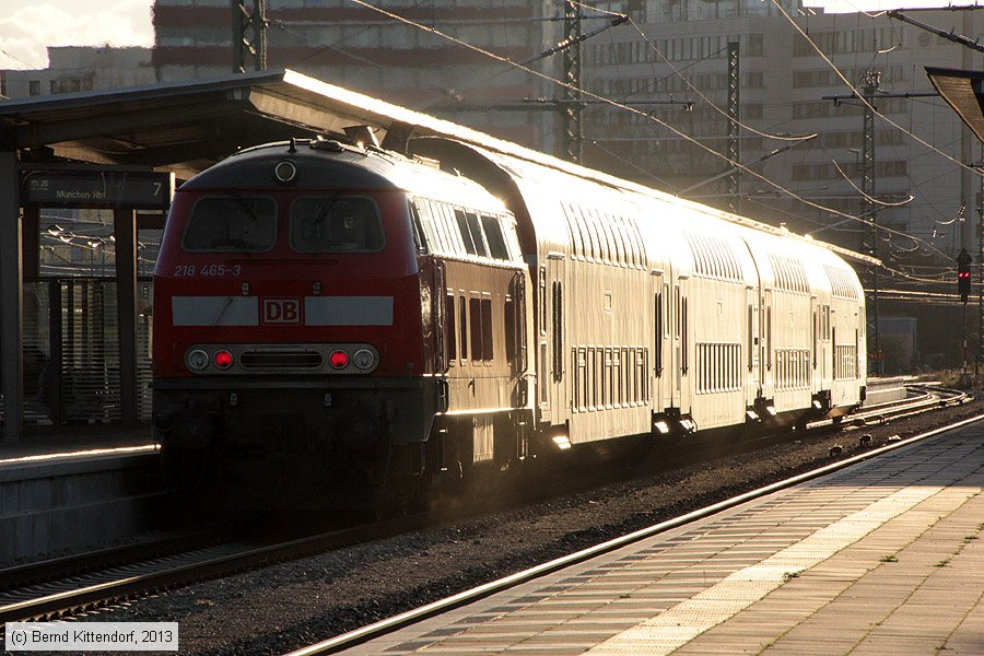 | Deutsche Bahn - 218465-3 Lok 218465-3 im Bahnhof München Ost auf Gleis 7, aufgenommen am 25. November 2013. Photo: Bernd Kittendorf (info@bernd-kittendorf.de) Homepage: www.bernd-kittendorf.de |