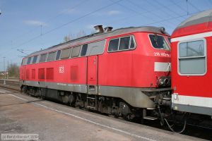 Lok 218 483-6 in Ludwigshafen (Rhein) Hauptbahnhof, aufgenommen am 25. März 2010 auf dem Abstellgleis 15 (einseitig angebunden, 44 Meter Nutzlänge). Rechts im Bild sind Anlagen der S-Bahn zu sehen.