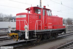 Lok 363 628-9 in Karlsruhe Hauptbahnhof, aufgenommen am 18. Februar 2006. Diese Lok wurde 1959 von MaK gebaut und war bei der Deutschen Bundesbahn zunächst mit der Betriebsnummer V60 628 im Einsatz.